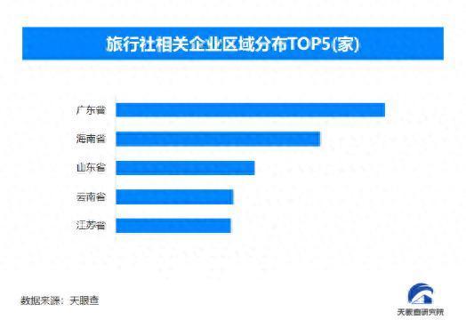 从区域分布来看,广东省、海南省、山东省旅行社相关企业数量位居前列,三个省市数量总和超过13.3万余家,占企业总数的29.35%。排在其后的是云南省和江苏省。